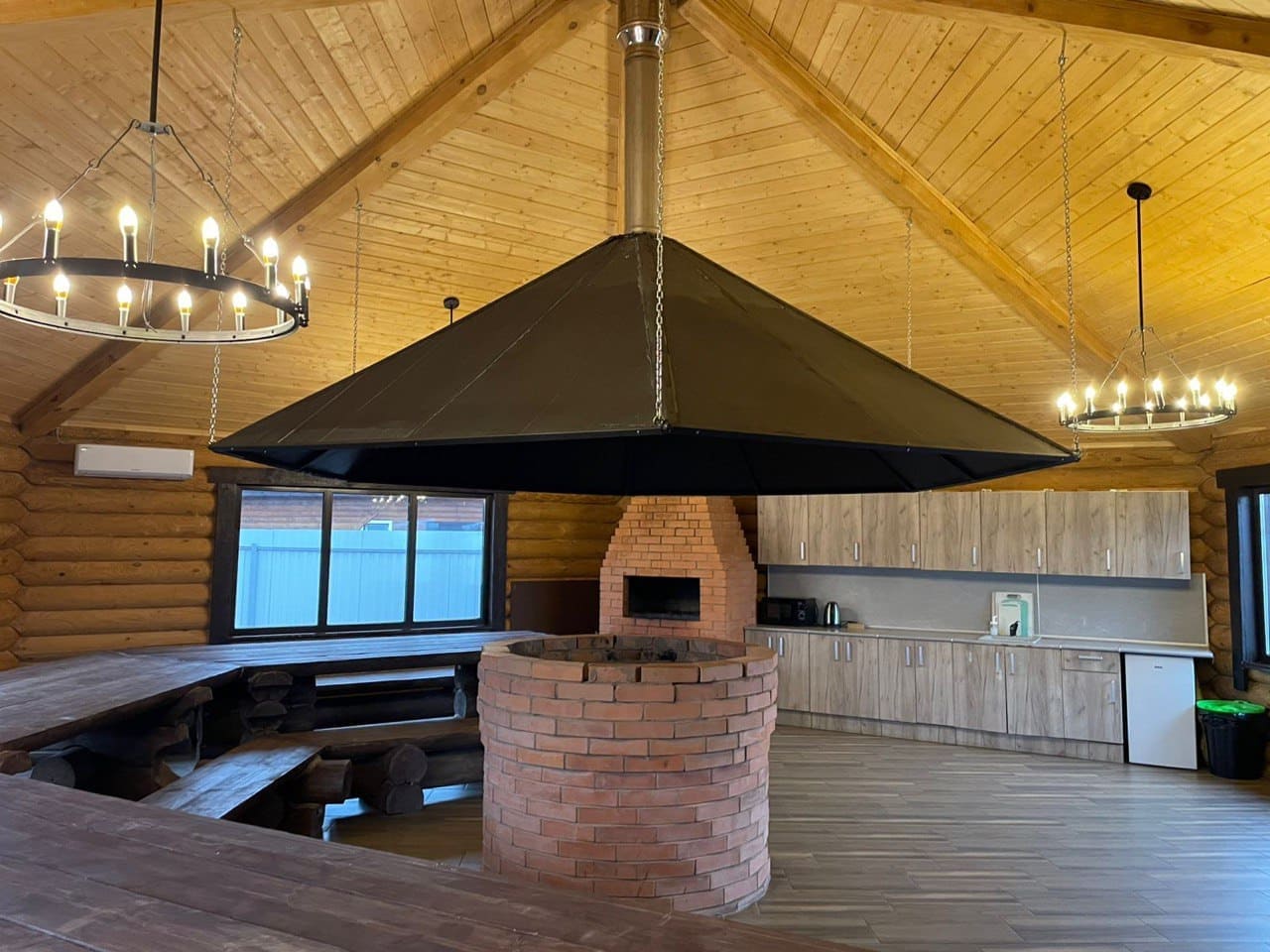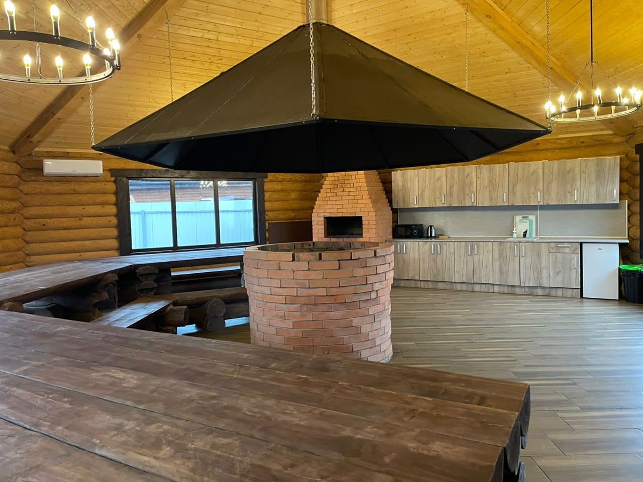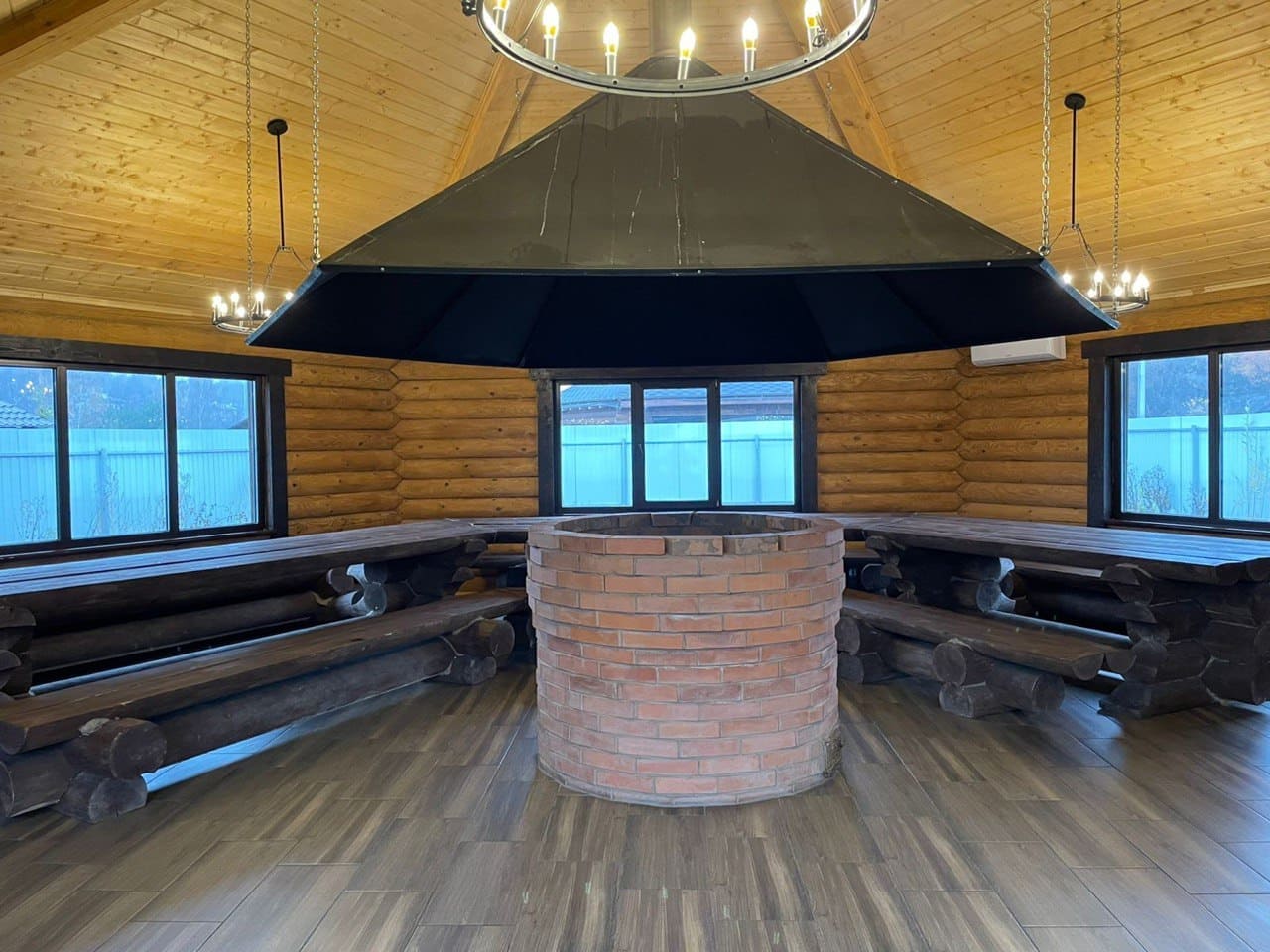 В центре беседки расположен очаг с живым огнем