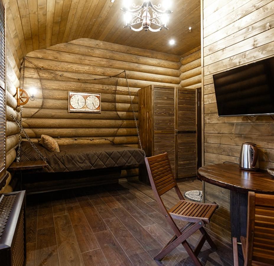 В номере две подвесных кровати и бочка-стол! Вы совершенно точно ощутите в нашей каюте дух морских приключений, а на большой старинной карте, быть может, откроете для себя новые неизведанные острова…