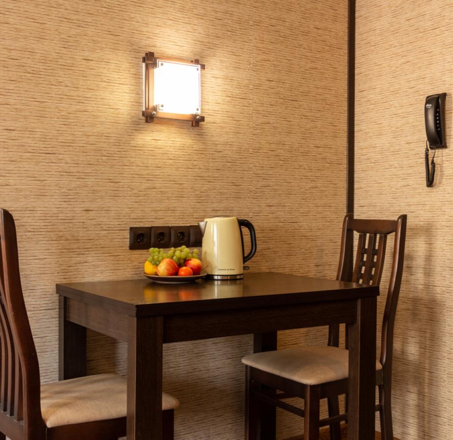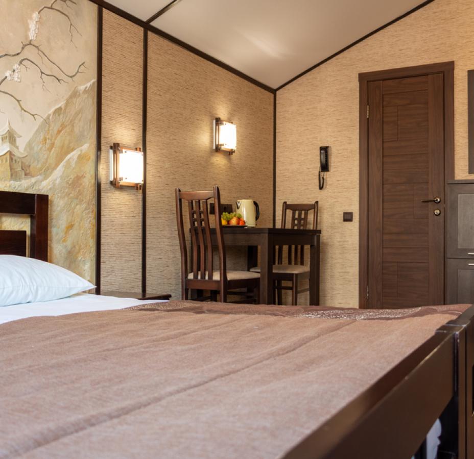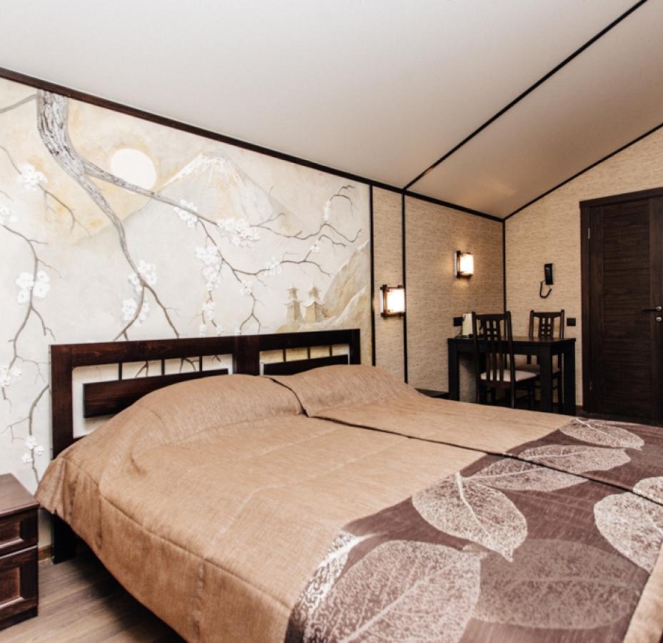 В оформлении номера — изящная фреска ручной работы «Сакура», изготовлена художником для отеля «LogHouse», а мебель из массива наполняет номер ароматом натурального дерева.