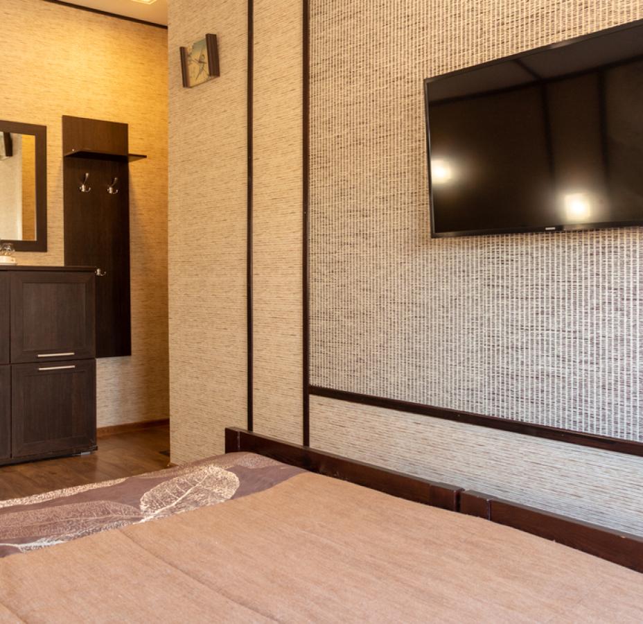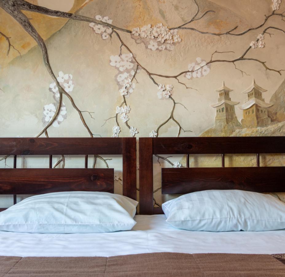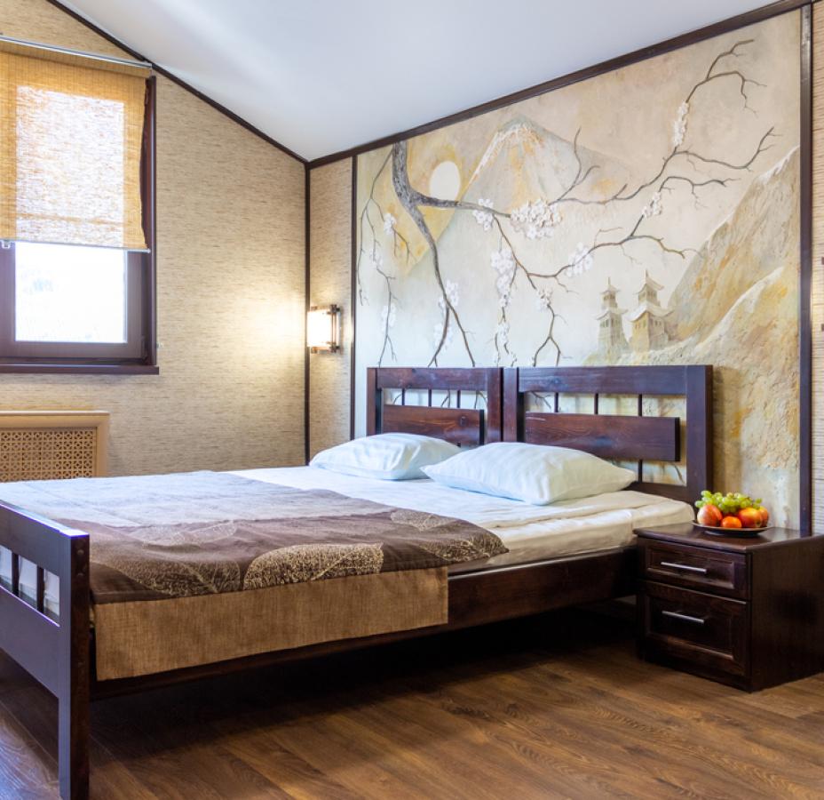 В оформлении номера — изящная фреска ручной работы «Сакура», изготовлена художником для отеля «LogHouse», а мебель из массива наполняет номер ароматом натурального дерева.